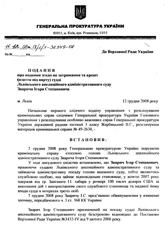 Кримінальну справу проти голови Львівського апеляційного адміністративного суду Ігоря Зварича за отримання хабара в розмірі 100 тисяч доларів було порушено 2 грудня. Наступного дня він пішов на лікарняний, а в ніч на 12 грудня зник. Тоді ж прокуратура оголосила його в розшук та направила подання до парламенту про згоду на арешт судді.