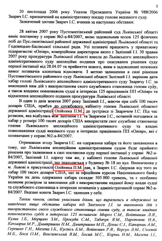 "Залізний І.І., маючи при собі 100 тисяч доларів, прибув до службового кабінету голови Львівської обласної державної адміністрації Олійника П.М., де зустрівся зі Зваричем І.С.