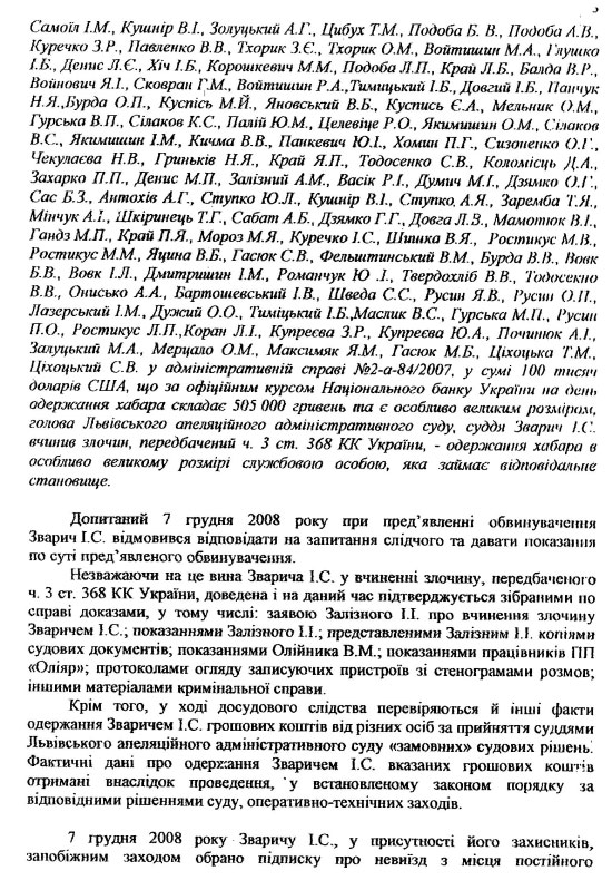 Отримавши згоду Зварича на одержання хабара та його запевнення в тому, що Львівським апеляційним адміністративним судом буде прийнято рішення про залишення в силі постанови суду першої інстанції, Залізний одразу там же, в кабінеті голови Львівської обласної державної адміністрації, в присутності Олійника П.М. дав, а Зварич одержав від того як хабар 100 тисяч доларів..."