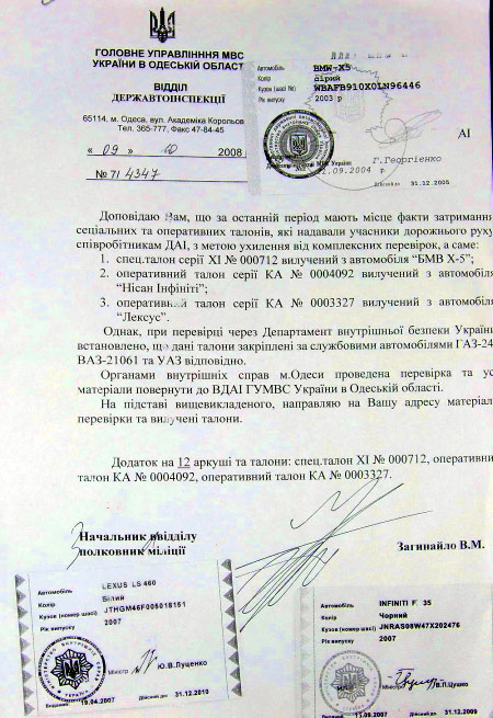 Автор позволил усомниться в чистоте помыслов власти. И решил установить - кому же выданы оперативные талоны, которые изъяли сотрудники одесского ГАИ. Сомнительно, чтобы доблестные украинские разведчики разъезжали на "инфинити", "лексусах", " BMW Х-5" и "Мерседесах".