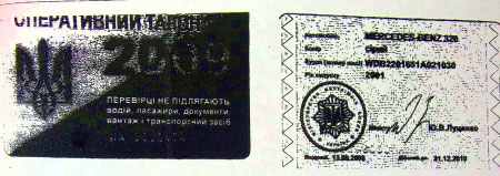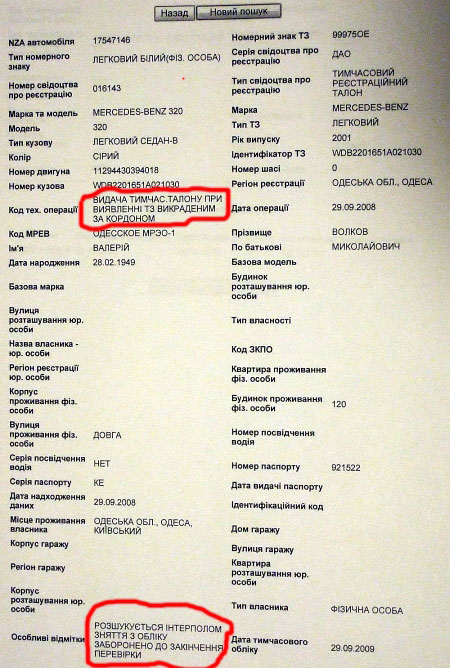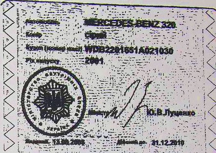 Проверка показала следующее: на серый Мерседес-320 2001 года выпуска был выписан талон за подписью министра Луценко, который значится за автомобилем "Мазда-626". "Мерседес" был угнан за границей, перегнан в Украину, и в сентябре 2008 года на него выдали временный техталон гражданину Валерию Волкову, 1949 года рождения.