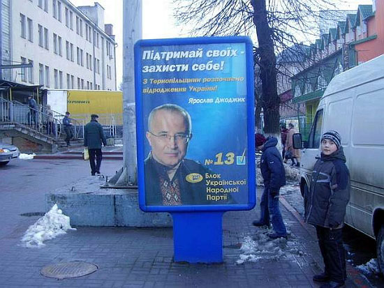 Ці щити висіли і в день виборів, бо формально не були прямою агітацією. "Наша Україна" також вела дуже слабку агітацію, наприклад, намети поставила в останні дні виборів. "Свобода" ж поставила намети по всьому місті в перший день оголошення виборів".