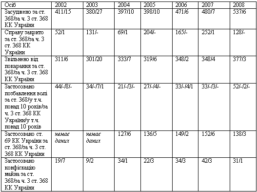 Для того, щоб отримати уявлення про існуючі сьогодні тенденції засудження за статтею 368 КК, пропонуємо ознайомитися з наступною таблицею.
