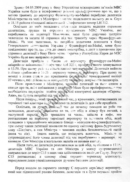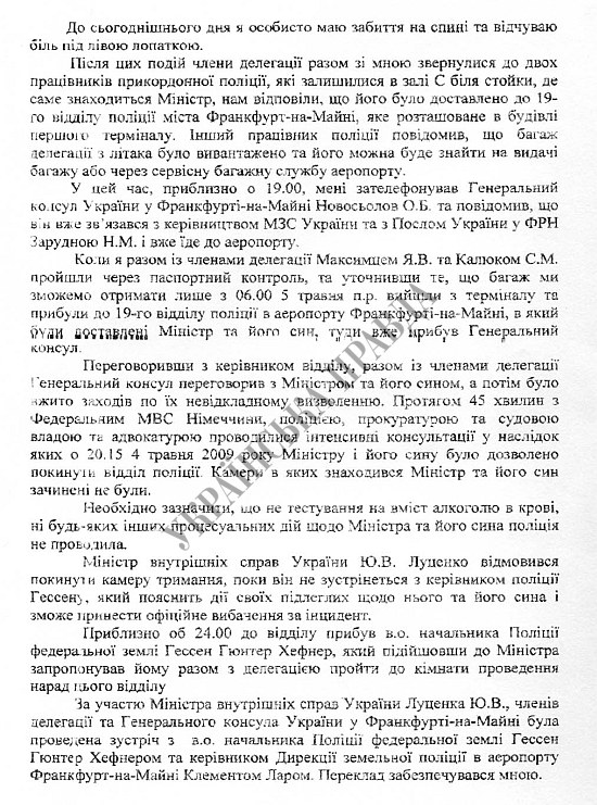 "За стійкою знаходилися дві працівниці "Люфтганзи", які несподівано зупинили міністра і сказали, що вони його на літак не пропустять, бо їм здається, нібито він нетверезий. На мою думку, це враження могло скластися у персоналу "Люфтганзи" тому, що міністр голосно сміявся, підходячи до стійки", - припускає консул.