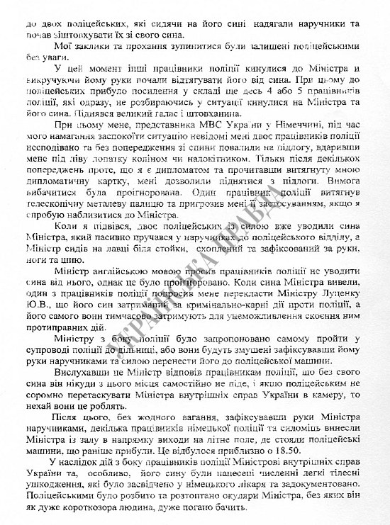При цьому мене, представника МВС України у Німеччині, під час мого намагання заспокоїти ситуацію двоє працівників поліції несподівано і без попередження зі спини повалили на підлогу. Коли я підвівся, двоє поліцейських із силою вже уводили сина міністра до поліцейського відділу.