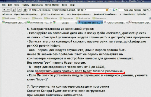 Чому ми стверджуємо, що на порті 4010 висить програма-шпигун? Є ще одне підтвердження - саме цей порт, 4010, наводиться в інструкції для встановлення "Скрытой камеры" як порт по замовчуванню - отже, фахівці з підслуховування, які ставили ці програми на редакційні комп'ютери, полінувалися змінити стандартні настройки, і залишили порт 4010.