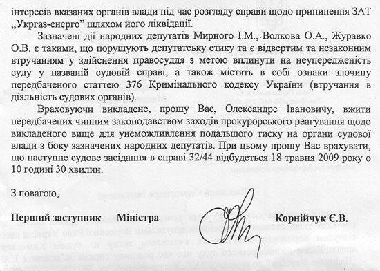 Однак, судячи з листа першого заступника міністра юстиції Євгена Корнійчука до генпрокурора Олександра Медведька, за "Укргаз-Енерго" активно стали на захист нардепи від Партії регіонів – Іван Мирний і Олександр Волков, які взяли в підмогу депутата-інваліда Олексія Журавка.