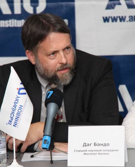 "Выступая вчера на круглом столе, организованном Американским Институтом на Украине, старший научный сотрудник Института Катона, вашингтонского авторитетного исследовательского центра в области либерализма, Даг Бандо, высказался в том смысле, что Украина допускает опасный просчет, связывая свою безопасность с членством в НАТО", - ідеться в нещодавньому прес-релізі American Institute in Ukraine.