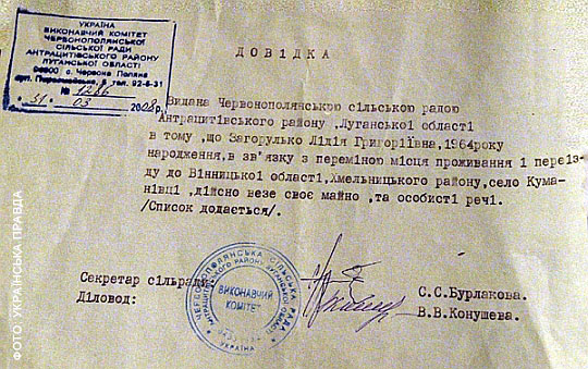 Последнее место ее проживания – Луганская область. В распоряжении редакции оказалась справка, выданная ей Червонопольским сельсоветом Антрацитовского района Луганской области о том, что Лидия Загорулько со всем своим имуществом переезжает назад на малую родину – в Винницкую область.