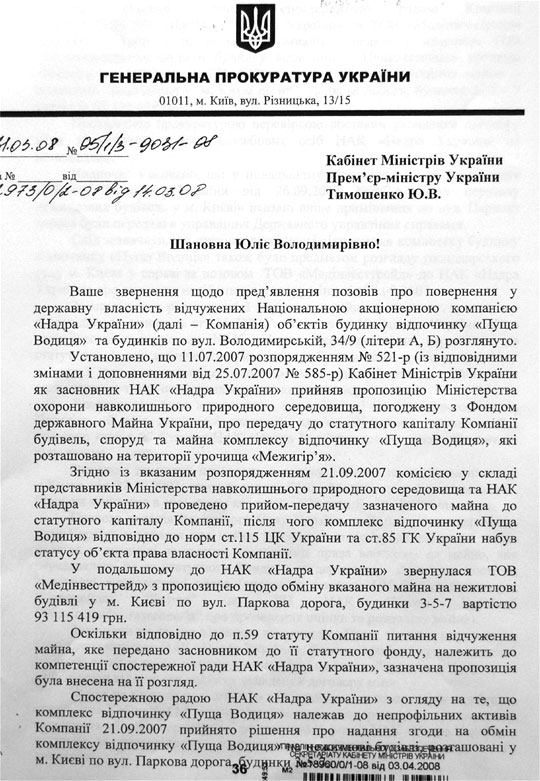 У березні 2008 генпрокурор Медведько написав Тимошенко, що дії посадовців "Надра України" з обміну резиденції "Межигір’я" були законними, і оскаржити їх неможливо.