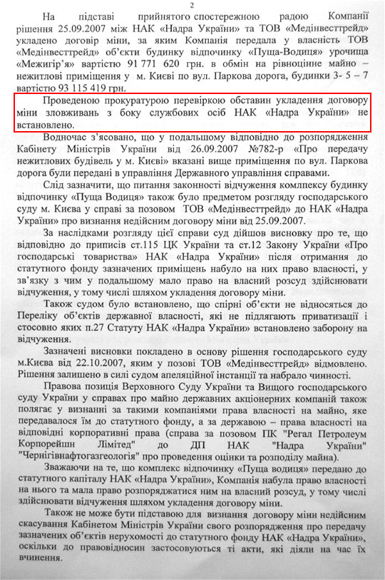 "У разі пред’явлення позову про визнання недійсним договору міни, буде передбачено вимоги до повернення майна сторонам. Однак будівлі по Парковій дорозі, отримані "Надра України", на даний час передані ДУС, є державною власністю, а тому їх вилучення призведе до порушення прав державного органу", - стверджував Медведько у своєму листі Тимошенко.