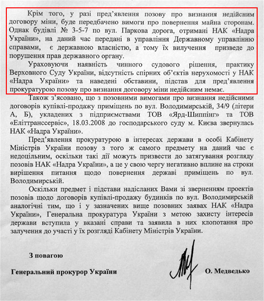 "Враховуючи наявність чинного судового рішення, практику Верховного суду, відсутність спірних об’єктів нерухомості у "Надра України", підстав для пред’явлення прокуратурою позову про визнання договору міни недійсним немає", - резюмував генпрокурор у березні 2008.