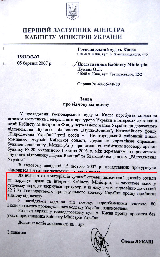 Листа підписала юрист-правдоборець з Партії регіонів Олена Лукаш, яка тоді була першим заступником міністра Кабінету міністрів. "Як вбачається з матеріалів справи, договір не порушує права та інтереси Кабміну", - аргументувала вона своє рішення в березні 2007.