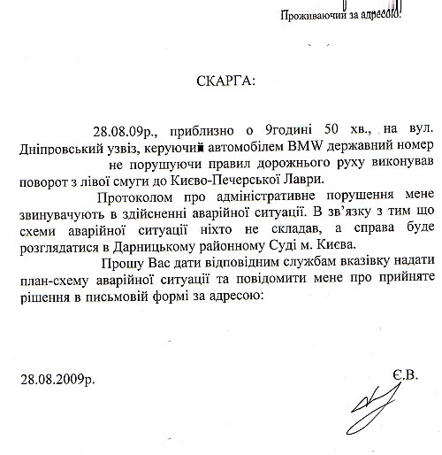 В этом документе, который водитель BMW предоставил "Украинской правде", утверждается, что он не пропустил кортеж Тимошенко, который двигался в попутном направлении с включенными "проблесковыми маячками".