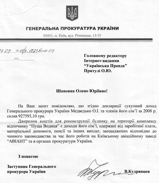 "Українська правда" звернулася з запитом до Медведька повідомити про джерела доходів, які дозволили йому, кар’єрному прокурору, облаштувати райське гніздечко в "Пущі-Водиці".