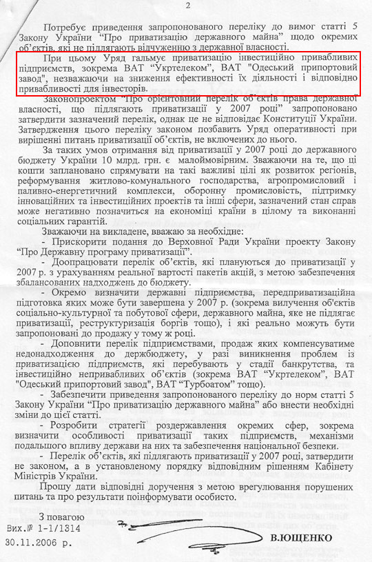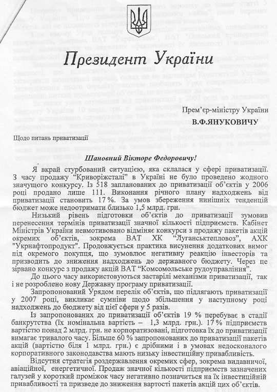 "Я крайне озабочен ситуацией, сложившейся в сфере приватизации. Со времени продажи Криворожстали в стране не было проведено ни единого значительного конкурса. (…) Правительство термозит инвестиционно-привлекательных объектов, в частности – Укртелеком, Одесский припортовый завод, не смотря на снижение эффективности их деятельности и привлекательности для инвесторов", - писал Ющенко в 2006-м.