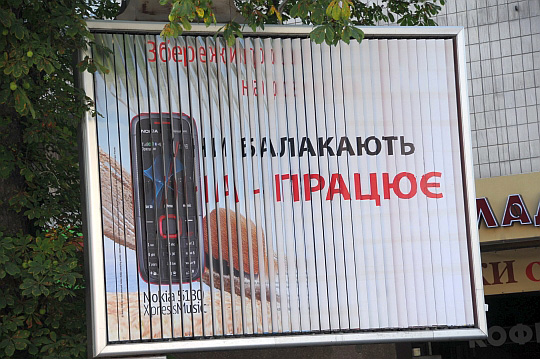 Мабуть, через острах "как би чєво нє вишло", було обрано настільки нейтральне вирішення зовнішньої реклами. Ніякого модерну, лише до болю знайоме обличчя на фоні прапорів і максимально обтічний слоган "Почую кожного" з номером телефону.