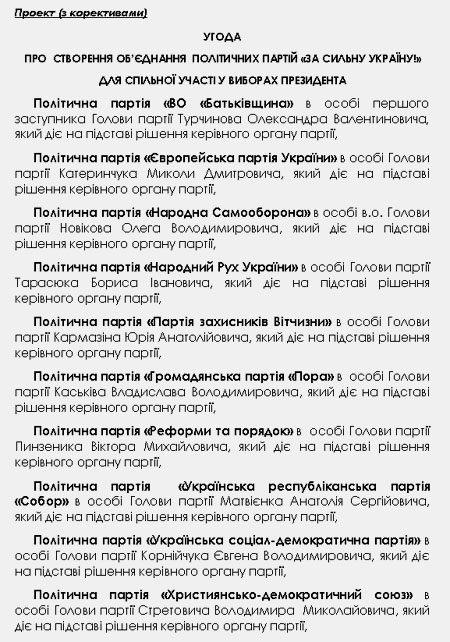 У розпорядження "Української правди" потрапив проект Угоди про створення об'єднання партій "За сильну Україну!" для спільної участі у президентських виборах.