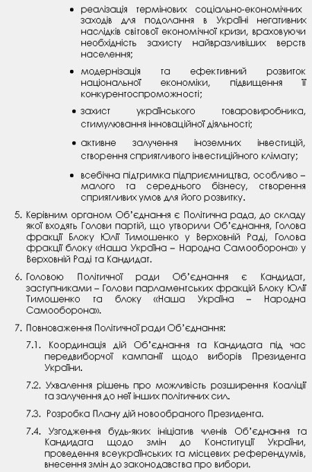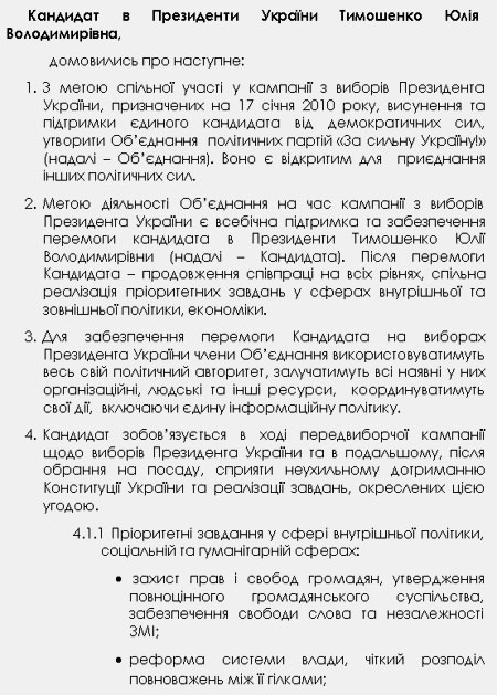 У договорі також є перелік "пріоритетних завдань у сфері внутрішньої політики, соціальній та гуманітарній сферах", які Тимошенко має реалізувати у разі обрання президентом.
