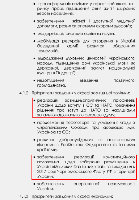 Окремо прописано зобов’язання для Тимошенко реалізувати "конституційне положення щодо заборони розміщення в Україні військових баз інших країн та виведення в 2017 році Чорноморського Флоту РФ".