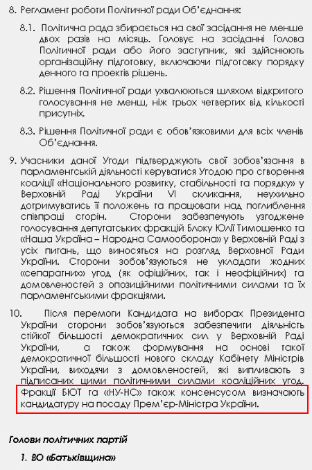 Тому допрацьована угода містить компромісне формулювання: "Фракції БЮТ та НУНС консенсусом визначають кандидатуру на посаду прем’єр-міністра".