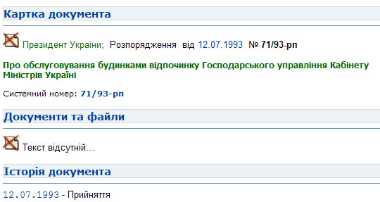 Ще 12 липня 1993 президент Кравчук видав розпорядження "Про обслуговування будинками відпочинку Господарського управління Кабінету міністрів". Минуло вже 16 років. Текст цього документу досі відсутній у єдиній базі "Законодавство України" на сайті Верховної Ради.