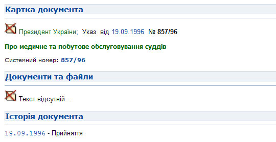 Теж давно, 19 вересня 1996 року президент Кучма видав указ "Про медичне і побутове обслуговування суддів". Текст цього документу все ще відсутній у базі "Законодавство України" на сайті парламенту.