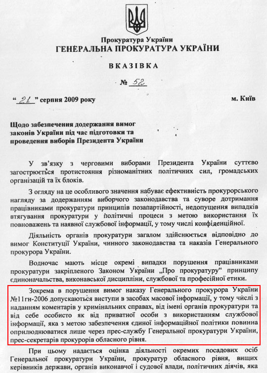 У розпорядження "Української правди" потрапила підписана Медведьком "Вказівка" внутрішнього прокурорського використання щодо "забезпечення додержання вимог законів України під час підготовки та проведення виборів президента".