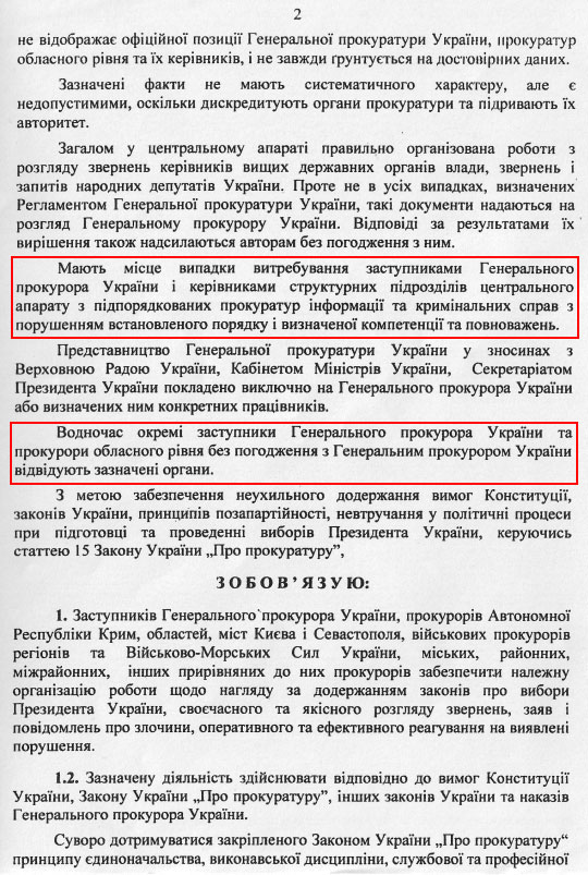 Але в подальшому текст стосується не порушень під час виборів, а… дисципліни в органах прокуратури та, зокрема, інформаційної політики Генеральної прокуратури.