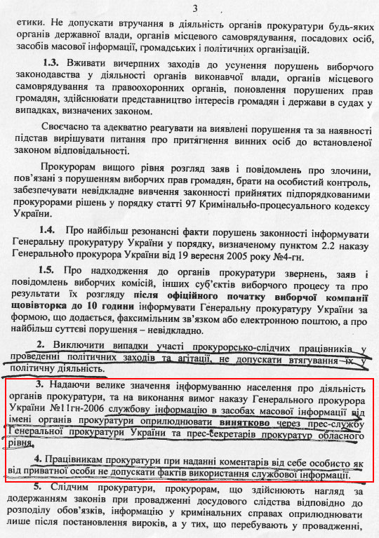 Третій пункт документу пояснює, як саме треба інтерпретувати таємний наказ: "службову інформацію в ЗМІ від імені органів прокуратури оприлюднювати винятково через прес-службу Генеральної прокуратури України та прес-секретарів прокуратур обласного рівня".
