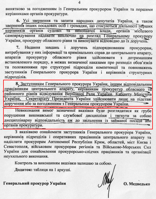 Тому одним з пунктів документу Олександр Медведько вводить монополію також на звернення громадян, нардепів та посадових осіб щодо діяльності перших керівників органів судової та виконавчої влади. Медведько підкреслює, що усі подібні запити потрібно "надавати виключно на розгляд Генеральному прокурору".