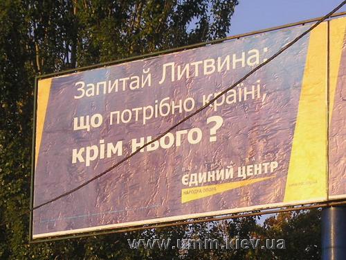 Єдиний Центр, по суті, повторює запитання Тигіпка, просто у іншому форматі. А Литвин іде дорогою Тимошенко, тільки міняє займенник "вона" на "він". Користь такої реклами – нульова, більше того, за відсутності агітації (а це є первинний продукт), пряма реклама (вторинна) фактично беззмістовна.