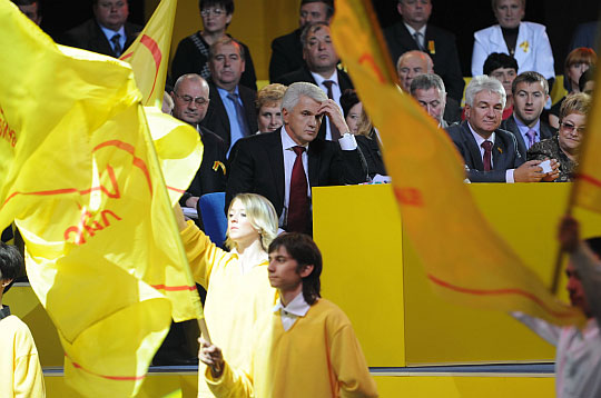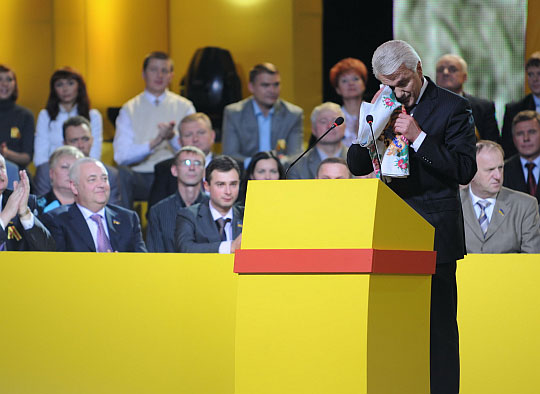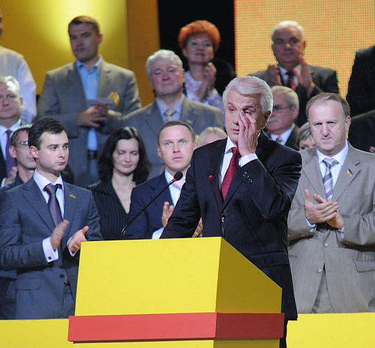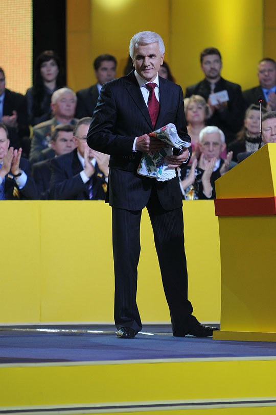 Зал заповнила музика "Время вперед!", з якої в Радянському Союзі починався кожен випуск новин. Проходами до сцени побігла молодь у жовтих сорочках із прапорами "Час Литвина". Сам же герой дня сидів з опущеною головою.