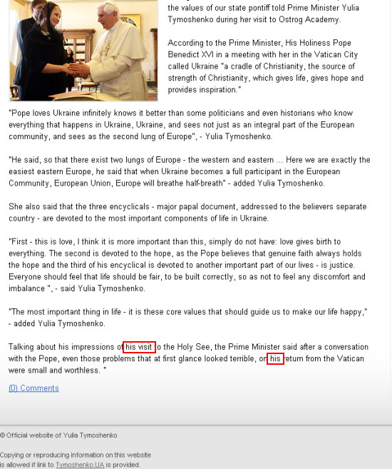 В перекладі ж Юлія Тимошенко перетворилася на особу чоловічої статі. "Talking about his impressions of his visit to the Holy See, the Prime Minister said after a conversation with the Pope, even those problems that at first glance looked terrible, on his return from the Vatican were small and worthless".