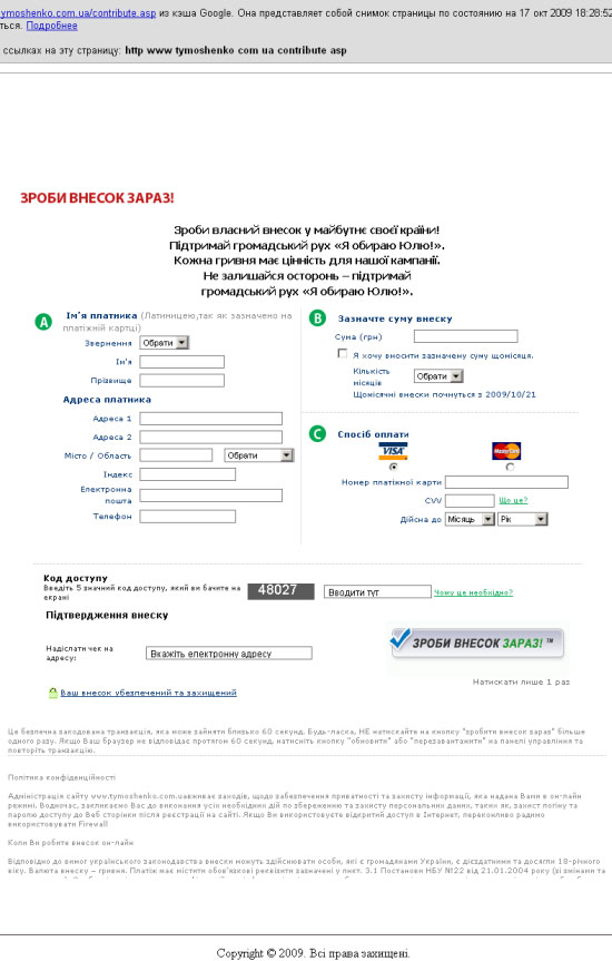 На сайті було розміщено форму, заповнивши яку, прихильники Тимошенко могли відправити гроші з кредитної картки на рахунок улюбленого кандидата.