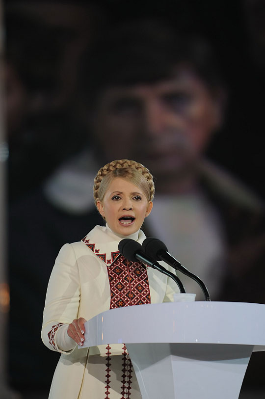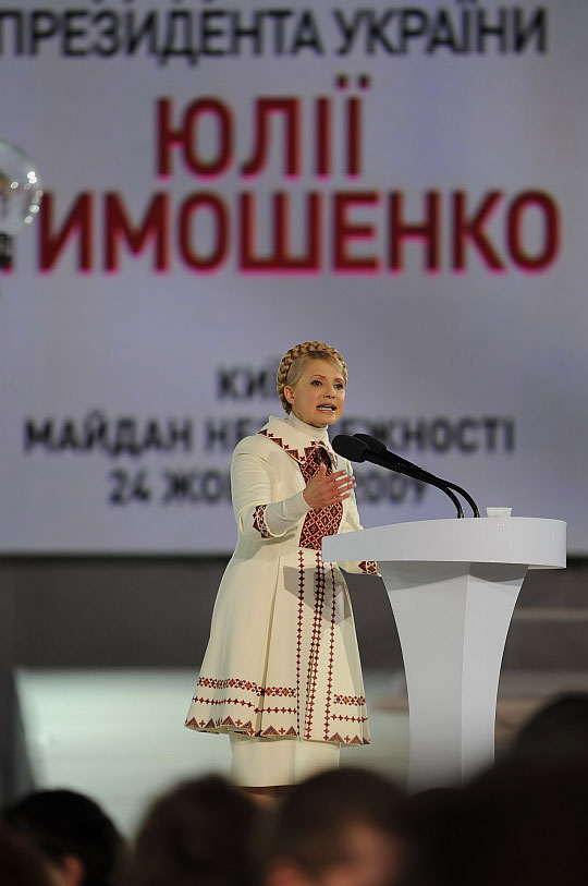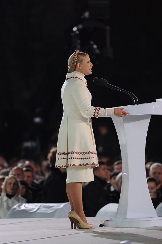 На краю подіуму, який розпочинався біля торгового центру "Глобус", з'явилася тендітна фігура в білому. Крок за кроком, Тимошенко наближалася до мікрофона. Незрозуміло, на чому більше концентрувалися присутні – на ній самій чи на бездоганному білому пальто з етнічним орнаментом. Як і в 2006 році, бютівські технологи вирішили експлуатувати образ Берегині.