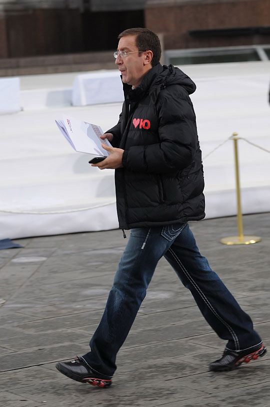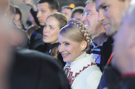 У цей момент до Майдану з боку перекритої вулиці Інститутської під'їхав кортеж Тимошенко. Прем’єр стрімко вийшла з машини та пішла в білий шатер за сценою. Туди ж заскочили Микола Баграєв, відповідальний за постановку мега–шоу, та Олександр Абдуллін, який очолює агітпроп в БЮТ.