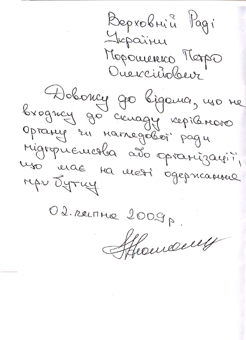 Разом з іншими документами Порошенко подав до Верховної Ради заяву, де наголосив, що не входить до складу керівних органів чи наглядових рад підприємств чи організацій, що мають на меті одержання прибутку.