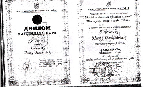 У 2002 році Порошенко захистив кандидатську дисертацію в юракадемії Сергія Ківалова.