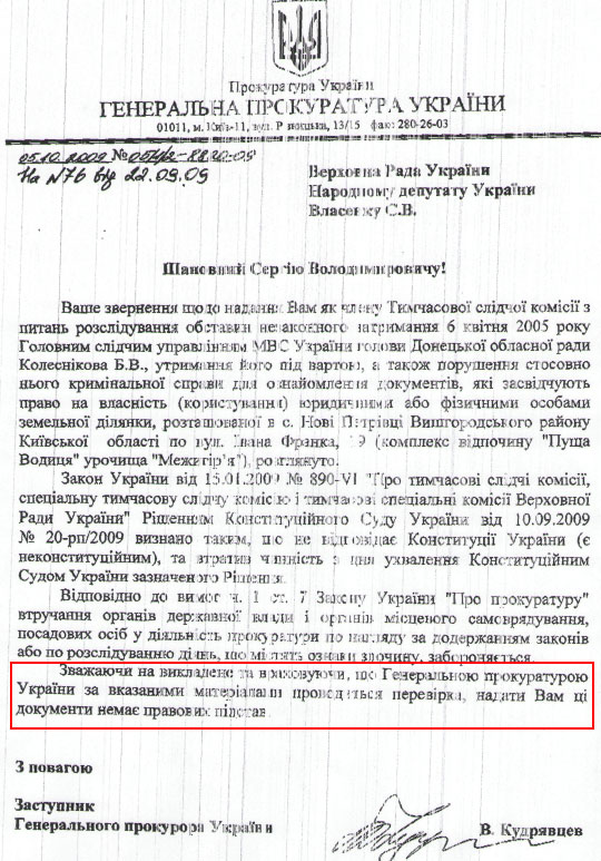 1 вересня 2009 року депутат Микола Джига, голова слідчої комісії парламенту, яка займається зовсім іншою темою – фальсифікаціями в справі Бориса Колеснікова – одноосібно, без рішення комісії пише доручення.