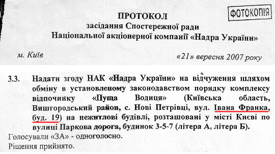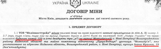 Взамін "Надра України" отримали від "МедІнвестТрейд" два напівзруйниваних будинки на Парковій дорозі в Києві. Але у власності національної компанії вони перебували тільки добу.