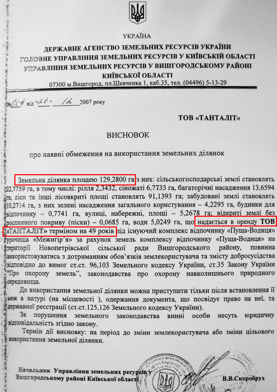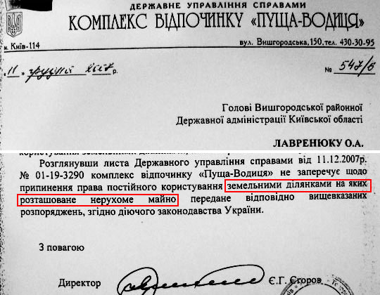 Керівник "Пуща-Водиці", підконтрольний Банковій, погодив операцію своїм листом від 11 грудня 2007 року.