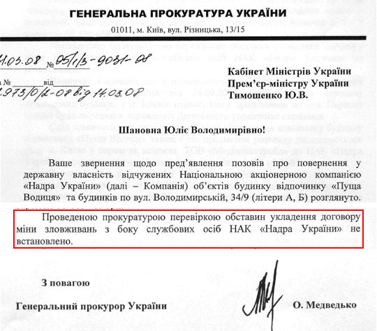 У березні 2008 генпрокурор Медведько написав Тимошенко, що дії посадовців "Надра України" з обміну резиденції "Межигір’я" були законними, і оскаржити їх неможливо.