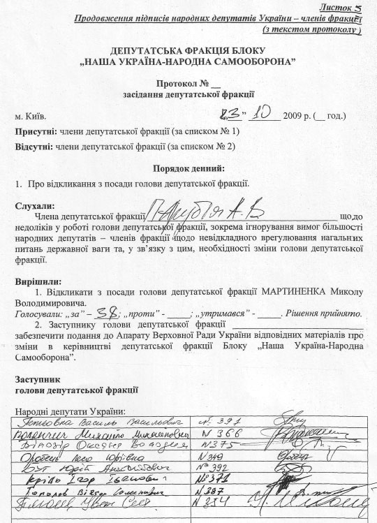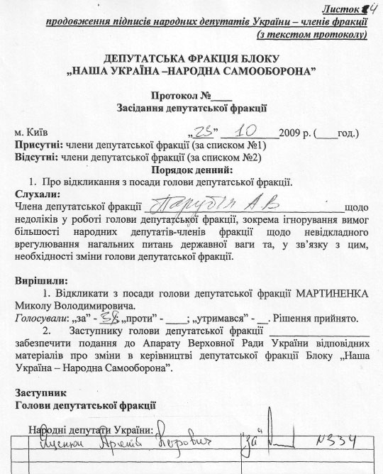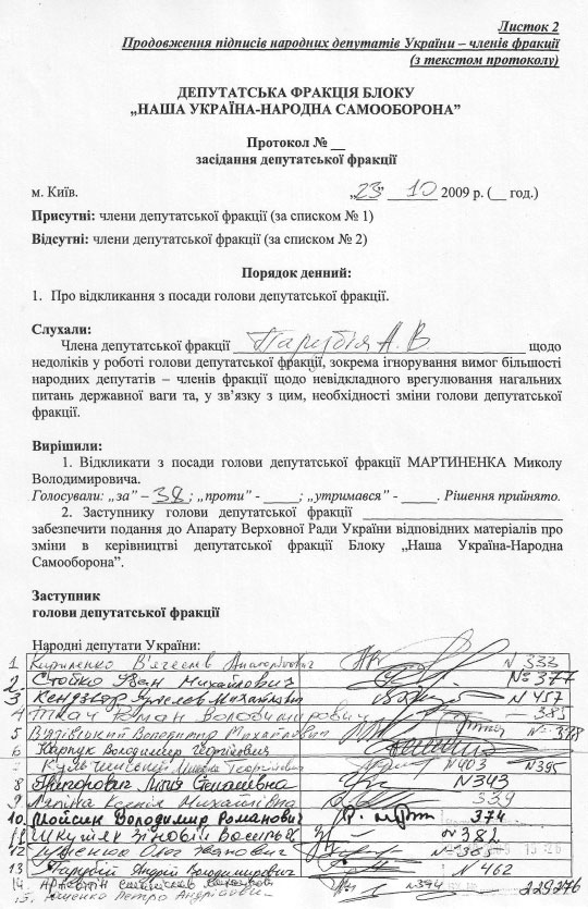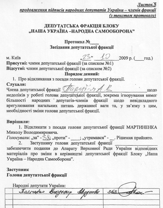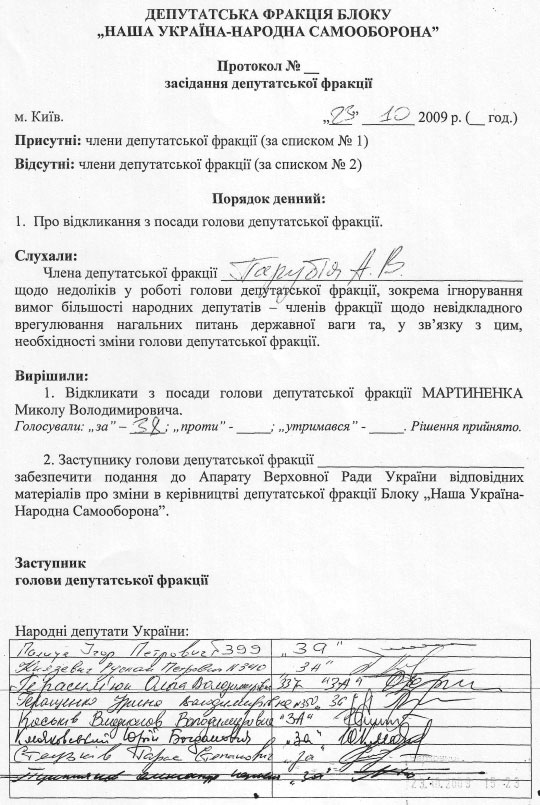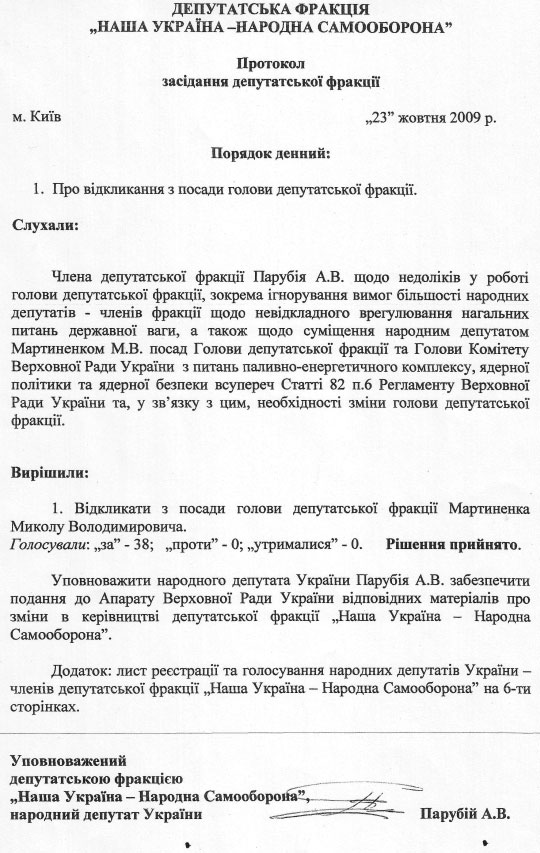 Тоді ж у п’ятницю до апарату Верховної Ради надійшов пакет документів, що складався з шести підписних листів та протоколу засідання фракції НУНС від 23 жовтня з порядком денним про відкликання Мартиненка. Який, власне, і зачитав Парубій з трибуни.