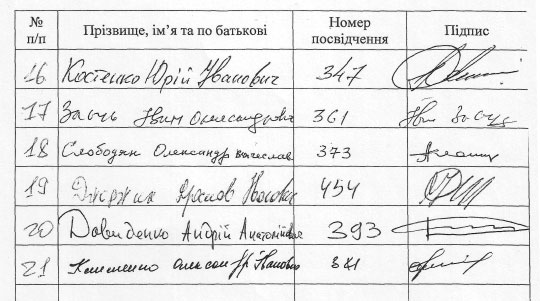 | На цьому аркуші присутні підписи Палиці, Князевича, Герасим'юк, Геращенко, Каськіва, Ключковського, Стецьківа. Автограф Третьякова закреслено |