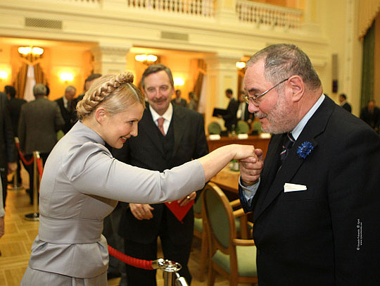 | Посол Франції Жак Фор вітає Тимошенко, а за цим спостерігає посол Німеччини Гамзьот |