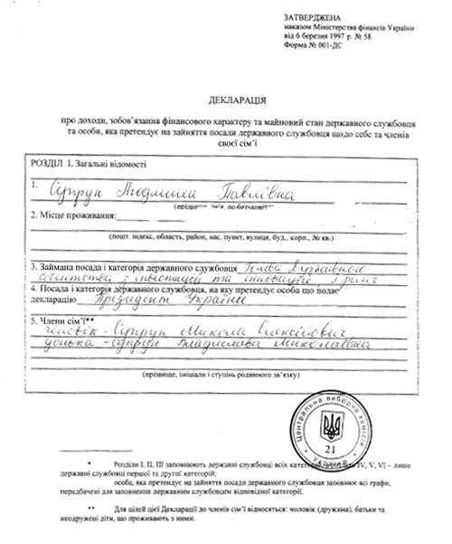 Кандидатка в президенти володіє 20 сотками землі, квартирою на 25 метрів і автомобілем мерседес. Її родина має більшу квартиру – на 50 метрів.