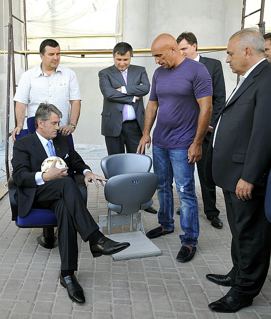| Ярославский показывает кресла, отобранные для стадиона в Харькове. Фото пресс-службы президента |