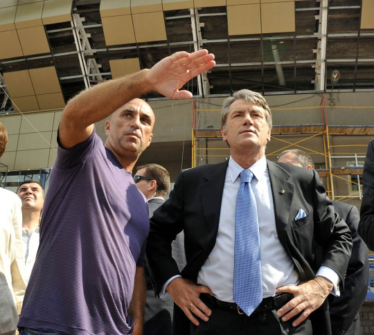 | Ярославский показывает Ющенко стройку стадиона в Харькове. Фото пресс-службы президента |