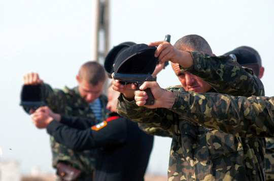 | Стрільба контрактників з пістолета. Беретами ловлять гільзи. Всі фото Олексія Горшкова |